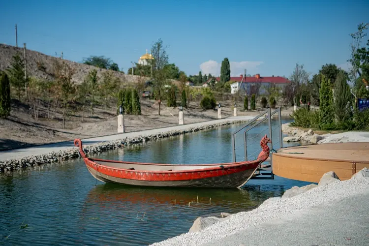 У причала стоит лодочка, скоро на ней можно будет прокатиться по древней реке и сделать снимки на память. На поверхности реки появятся импровизированные фонтаны, и в вечернее время будет представление с подсветкой.